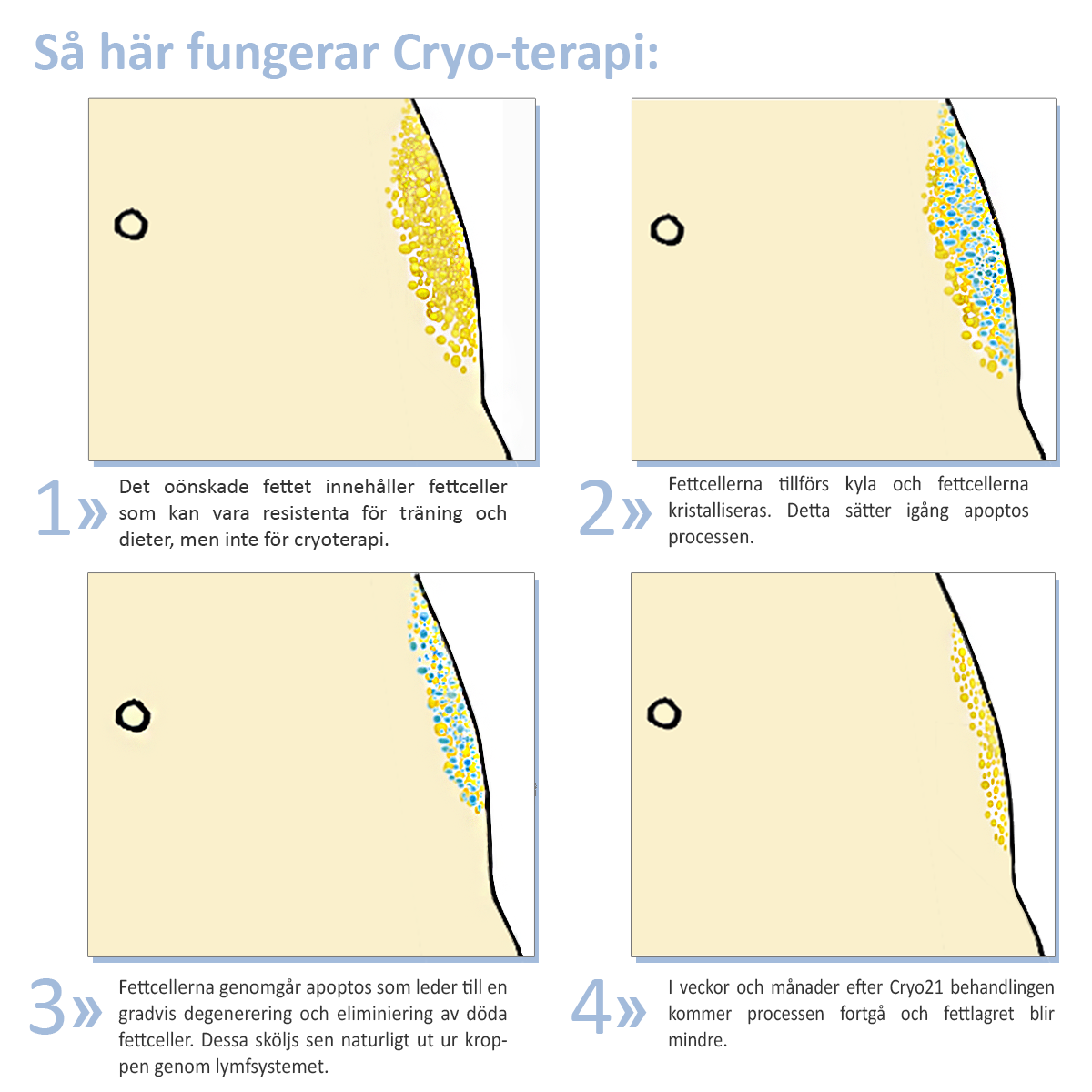 (Cryoterapi) är FDA/CE-godkänd, samt godkänd av American Academy of Cosmetic Surgery. Behandlingen är helt trygg och ofarlig – utan någon form av biverkningar. Behandlingen känns som en kylig men behaglig massage.
